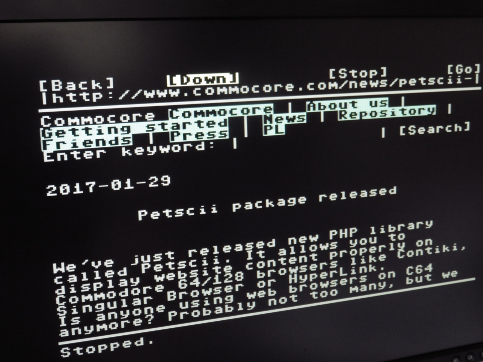 Właśnie wydaliśmy nową bibliotekę PHP o nazwie Petscii. Umożliwia ona dostosowanie stron internetowych do poprawnego wyświetlania treści na Commodore 64/128 w przeglądarkach takich jak Contiki, Singular Browser czy HyperLink.